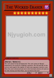 The Wicked Eraser DARK / Fiend / Level 10 / ATK ? / DEF ? This card cannot be Special Summoned. This card cannot be Normal Summoned or Set except by Tributing 3 monsters. The ATK and DEF of this card are each equal to the number of cards your opponent controls x 1000. When this card is destroyed and sent to the Graveyard, destroy all cards on the field. During your Main Phase, you can destroy this card. SUPER RARE |