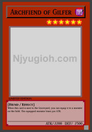 Archfiend of Gilfer DARK / Fiend / Level 6 / ATK 2200 / DEF 2500 When this card is sent to the Graveyard, you can equip it to a monster on the field. The equipped monster loses 500 ATK. SUPER RARE |