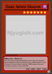 Dark Armed Dragon DARK / Dragon / Level 7 / ATK 2800 / DEF 1000 This card cannot be Normal Summoned or Set. This card cannot be Special Summoned except by having exactly 3 DARK monsters in your Graveyard. You can remove from play 1 DARK monster from your Graveyard to destroy 1 card on the field. SUPER RARE |