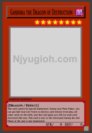 Destruction DARK / Dragon / Level 8 / ATK 0 / DEF 0 This card cannot be Special Summoned. During your Main Phase, you can pay half your Life Points to destroy, and remove from play, all other cards on the field, and this card gains 300 ATK for each card destroyed this way. This card is sent to the Graveyard during the End Phase of the turn it was Summoned. SUPER RARE |