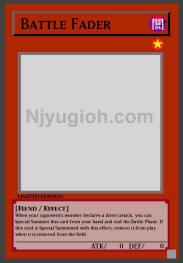 Battle Fader DARK / Fiend / Level 1 / ATK 0 / DEF 0 When your opponent's monster declares a direct attack, you can Special Summon this card from your hand and end the Battle Phase. If this card is Special Summoned with this effect, remove it from play when it is removed from the field. SUPER RARE |