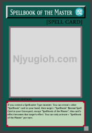 Spellbook of the Master Normal Spell If you control a Spellcaster-Type monster: You can reveal 1 other "Spellbook" card in your hand, then target 1 "Spellbook" Normal Spell Card in your Graveyard, except "Spellbook of the Master"; this card's effect becomes that target's effect. You can only activate 1 "Spellbook of the Master" per turn. SUPER RARE |