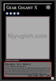 Gear Gigant X EARTH / Machine-Type Xyz / Rank 4 / ATK 2300 / DEF 1500 2 Level 4 Machine-Type monsters Once per turn: You can detach 1 Xyz Material from this card; add 1 Level 4 or lower Machine-Type monster from your Deck or Graveyard to your hand. When this card leaves the field: You can target 1 Level 3 or lower "Geargia" monster in your Graveyard; Special Summon that target. SUPER RARE |