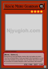 Koa'ki Meiru Guardian EARTH / Rock / Level 4 / ATK 1900 / DEF 1200 During each of your End Phases, destroy this card unless you send 1 "Iron Core of Koa'ki Meiru" from your hand to the Graveyard or reveal 1 Rock-Type monster in your hand. You can Tribute this card to negate the activation of an Effect Monster's effect and destroy that monster. SUPER RARE |