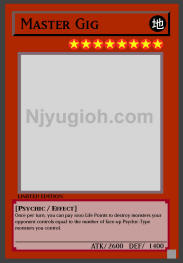 Master Gig EARTH / Psychic / Level 8 / ATK 2600 / DEF 1400 Once per turn, you can pay 1000 Life Points to destroy monsters your opponent controls equal to the number of face-up Psychic-Type monsters you control. SUPER RARE |
