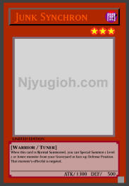 Junk Synchron DARK / Warrior-Type Tuner / Level 3 / ATK 1300 / DEF 500 When this card is Normal Summoned, you can Special Summon 1 Level 2 or lower monster from your Graveyard in face-up Defense Position. That monster's effect(s) is negated. ULTRA RARE |