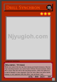 Drill Synchron EARTH / Machine-Type Tuner / Level 3 / ATK 800 / DEF 300 While you control this face-up card, during each battle between a Warrior-Type attacking monster you control and a Defense Position monster whose DEF is lower than the ATK of the attacking monster, inflict the difference as Battle Damage to your opponent. Once per turn, when you inflict battle damage to your opponent with this effect, you can draw 1 card. ULTRA RARE |