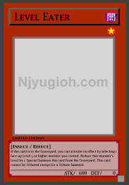 Level Eater DARK / Insect / Level 1 / ATK 600 / DEF 0 If this card is in the Graveyard, you can activate its effect by selecting 1 face-up Level 5 or higher monster you control. Reduce that monster's Level by 1. Special Summon this card from the Graveyard. This card cannot be Tributed except for a Tribute Summon. SUPER RARE |