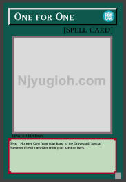 One for One Normal Spell Send 1 Monster Card from your hand to the Graveyard. Special Summon 1 Level 1 monster from your hand or Deck. SUPER RARE |