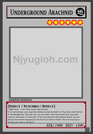 Underground Arachnid EARTH / Insect-Type Synchro / Level 6 / ATK 2400 / DEF 1200 1 DARK Tuner + 1 non-Tuner Insect-Type monster If this card attacks, your opponent cannot activate any Spell or Trap Cards until the end of the Damage Step. Once per turn, you can select 1 face-up monster your opponent controls, and equip it to this card. If this card would be destroyed by battle, you can destroy the monster equipped to this card by its effect instead. (You can only equip 1 monster at a time to this card.) SUPER RARE |