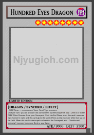 Hundred Eyes Dragon DARK / Dragon-Type Synchro / Level 8 / ATK 3000 / DEF 2500 1 DARK Tuner + 1 or more non-Tuner Fiend-Type monsters Once per turn, you can activate this card's effect by removing from play 1 Level 6 or lower DARK Effect Monster from your Graveyard. Until the End Phase, treat this card's name as that monster's name and this card gains the same effects as that monster while face-up on the field. When this card is destroyed and sent to the Graveyard, add 1 "Earthbound Immortal" monster from your Deck to your hand. SUPER RARE |