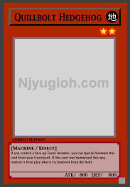 Quillbolt Hedgehog EARTH / Machine / Level 2 / ATK 800 / DEF 800 If you control a face-up Tuner monster, you can Special Summon this card from your Graveyard. If this card was Summoned this way, remove it from play when it is removed from the field. SUPER RARE |