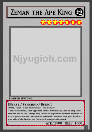 Zeman the Ape King EARTH / Beast-Type Synchro / Level 7 / ATK 2500 / DEF 1800 1 DARK Tuner + 1 non-Tuner Beast-Type monster If this card attacks, your opponent cannot activate any Spell or Trap Cards until the end of the Damage Step. When an opponent's monster declares an attack, you can select that monster and send 1 monster from your hand or your side of the field to the Graveyard to negate the attack. SUPER RARE |