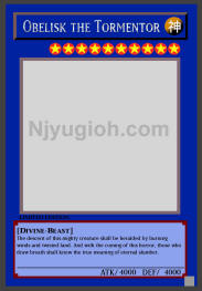 Obelisk the Tormentor (original artwork) DIVINE / Divine-Beast / Level 10 / ATK 4000 / DEF 4000 The descent of this mighty creature shall be heralded by burning winds and twisted land. And with the coming of this horror, those who draw breath shall know the true meaning of eternal slumber. PRISMATIC SECRET RARE |