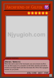 Archfiend of Gilfer DARK / Fiend / Level 6 / ATK 2200 / DEF 2500 When this card is sent to the Graveyard, you can activate its effect. You can then equip it to a monster on the field, and this card will be treated as an Equip Spell Card that decreases the ATK of the equipped monster by 500 points. ULTRA RARE |