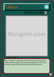 Unity Quick-Play Spell Select 1 monster on your side of the field. The DEF of the selected monster becomes equal to the combined original DEF of all face-up monsters on your side of the field, until the end of this turn. ULTRA RARE |