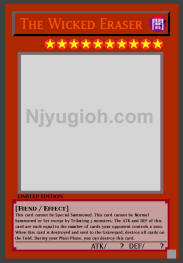 The Wicked Eraser DARK / Fiend / Level 10 / ATK ? / DEF ? This card cannot be Special Summoned. This card cannot be Normal Summoned or Set except by Tributing 3 monsters. The ATK and DEF of this card are each equal to the number of cards your opponent controls x 1000. When this card is destroyed and sent to the Graveyard, destroy all cards on the field. During your Main Phase, you can destroy this card. ULTRA RARE |