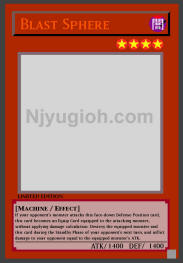 Blast Sphere DARK / Machine / Level 4 / ATK 1400 / DEF 1400 If your opponent's monster attacks this face-down Defense Position card, this card becomes an Equip Card equipped to the attacking monster, without applying damage calculation. Destroy the equipped monster and this card during the Standby Phase of your opponent's next turn, and inflict damage to your opponent equal to the equipped monster's ATK. ULTRA RARE |