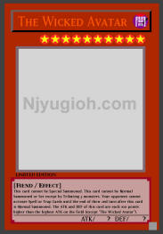 The Wicked Avatar DARK / Fiend / Level 10 / ATK ? / DEF ? This card cannot be Special Summoned. This card cannot be Normal Summoned or Set except by Tributing 3 monsters. Your opponent cannot activate Spell or Trap Cards until the end of their 2nd turn after this card is Normal Summoned. The ATK and DEF of this card are each 100 points higher than the highest ATK on the field (except "The Wicked Avatar"). ULTRA RARE |
