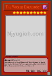 The Wicked Dreadroot DARK / Fiend / Level 10 / ATK 4000 / DEF 4000 This card cannot be Special Summoned. This card cannot be Normal Summoned or Set except by Tributing 3 monsters. Halve the ATK and DEF of all monsters on the field, except this card. ULTRA RARE |