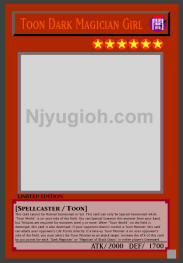 Toon Dark Magician Girl DARK / Spellcaster-Type Toon / Level 6 / ATK 2000 / DEF 1700 This card cannot be Normal Summoned or Set. This card can only be Special Summoned while "Toon World" is on your side of the field. You can Special Summon this monster from your hand, but Tributes are required for monsters Level 5 or more. When "Toon World" on the field is destroyed, this card is also destroyed. If your opponent doesn't control a Toon Monster, this card can attack your opponent's Life Points directly. If a face-up Toon Monster is on your opponent's side of the field, you must select the Toon Monster as an attack target. Increase the ATK of this card by 300 points for each "Dark Magician" or "Magician of Black Chaos" in either player's Graveyard. ULTRA RARE |
