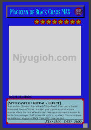 Magician of Black Chaos MAX DARK / Spellcaster-Type Ritual / Level 8 / ATK 2800 / DEF 2600 You can Ritual Summon this card with "Chaos Form". If this card is Special Summoned: You can Tribute 1 monster; your opponent cannot activate monster effects this turn. When this card destroys an opponent's monster by battle: You can target 1 Spell in your GY; add it to your hand. You can only use each effect of "Magician of Black Chaos MAX" once per turn. PRISMATIC SECRET RARE |