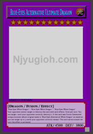 Blue-Eyes Alternative Ultimate Dragon LIGHT / Dragon-Type Fusion / Level 12 / ATK 4500 / DEF 3800 "Blue-Eyes White Dragon" + "Blue-Eyes White Dragon" + "Blue-Eyes White Dragon" Your opponent cannot target or destroy this card with card effects. Once per turn: You can target 1 card your opponent controls; destroy it. If this card was Fusion Summoned using a monster whose original name is "Blue-Eyes Alternative White Dragon" as material, you can target up to 3 cards your opponent controls instead. This card cannot attack the turn this effect is activated. PRISMATIC SECRET RARE |