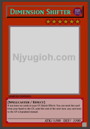 Dimension Shifter DARK / Spellcaster / Level 6 / ATK 1200 / DEF 2200 If you have no cards in your GY (Quick Effect): You can send this card from your hand to the GY; until the end of the next turn, any card sent to the GY is banished instead. PRISMATIC SECRET RARE |