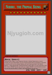 Nibiru, the Primal Being LIGHT / Rock / Level 11 / ATK 3000 / DEF 600 During the Main Phase, if your opponent Normal or Special Summoned 5 or more monsters this turn (Quick Effect): You can Tribute as many face-up monsters on the field as possible, and if you do, Special Summon this card from your hand, then Special Summon 1 "Primal Being Token" (Rock/LIGHT/Level 11/ATK ?/DEF ?) to your opponent's field. (This Token's ATK/DEF become the combined original ATK/DEF of the Tributed monsters.) You can only use this effect of "Nibiru, the Primal Being" once per turn. PRISMATIC SECRET RARE |