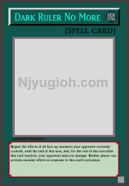 Dark Ruler No More Normal Spell Negate the effects of all face-up monsters your opponent currently controls, until the end of this turn, also, for the rest of this turn after this card resolves, your opponent takes no damage. Neither player can activate monster effects in response to this card's activation. PRISMATIC SECRET RARE |