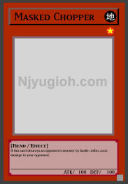 Masked Chopper EARTH / Fiend / Level 1 / ATK 100 / DEF 100 If this card destroys an opponent's monster by battle, inflict 2000 damage to your opponent. SUPER RARE |