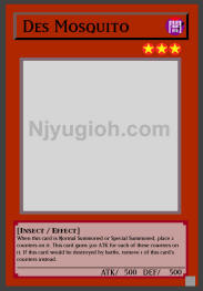 Des Mosquito DARK / Insect / Level 3 / ATK 500 / DEF 500 When this card is Normal Summoned or Special Summoned, place 2 counters on it. This card gains 500 ATK for each of these counters on it. If this card would be destroyed by battle, remove 1 of this card's counters instead. SUPER RARE |