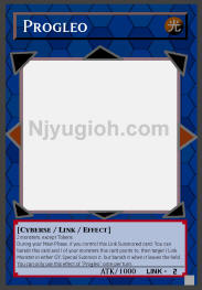 Progleo LIGHT / Cyberse-Type Link / ATK 1000 / Link-2 2 monsters, except Tokens During your Main Phase, if you control this Link Summoned card: You can banish this card and 1 of your monsters this card points to, then target 1 Link Monster in either GY; Special Summon it, but banish it when it leaves the field. You can only use this effect of "Progleo" once per turn. SUPER RARE |