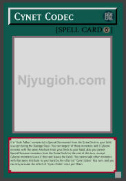 Cynet Codec Continuous Spell If a "Code Talker" monster(s) is Special Summoned from the Extra Deck to your field (except during the Damage Step): You can target 1 of those monsters; add 1 Cyberse monster with the same Attribute from your Deck to your hand, also you cannot Special Summon monsters from the Extra Deck for the rest of this turn, except Cyberse monsters (even if this card leaves the field). You cannot add other monsters with that same Attribute to your hand by the effect of "Cynet Codec" this turn, and you can only activate the effect of "Cynet Codec" once per Chain. SUPER RARE |