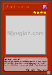 Ape Fighter DARK / Beast / Level 4 / ATK 1900 / DEF 1200 Each time this card destroys an opponent's monster by battle, this card gains 300 ATK. If this card does not attack during your turn, the ATK gained from this effect returns to 0 during the End Phase of that turn. ULTRA RARE |