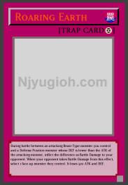 Roaring Earth Continuous Trap During battle between an attacking Beast-Type monster you control and a Defense Position monster whose DEF is lower than the ATK of the attacking monster, inflict the difference as Battle Damage to your opponent. When your opponent takes Battle Damage from this effect, select 1 face-up monster they control. It loses 500 ATK and DEF. ULTRA RARE |