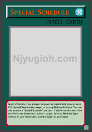 Special Schedule Normal Spell Target 1 Machine-Type monster in your Graveyard with 3000 or more ATK; Special Summon that target in face-up Defense Position. You can only activate 1 "Special Schedule" per turn. If this Set card is sent from the field to the Graveyard: You can target 1 Level 10 Machine-Type monster in your Graveyard; add that target to your hand. ULTRA RARE |