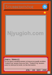 Stubbeditstoe WATER / Aqua / Level 1 / ATK 100 / DEF 2000 You can waste a worthless monster to bring out an equally worthless "Croaked Frog" monster from your Deck. "Croaked Frog" monsters cannot be destroyed by battle, not that that matters. RARE |