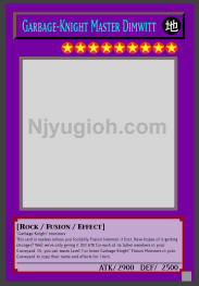 Garbage-Knight Master Dimwitt EARTH / Rock-Type Fusion / Level 9 / ATK 2900 / DEF 2500 3 "Garbage-Knight" monsters This card is useless unless you foolishly Fusion Summon it first. Have hopes of it getting stronger? Well we're only giving it 100 ATK for each of its fallen members in your Graveyard. Or, you can waste Level 7 or lower Garbage-Knight" Fusion Monsters in your Graveyard to copy their name and effects for 1 turn. SECRET RARE |