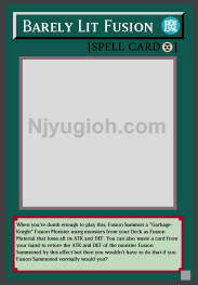 Barely Lit Fusion Continuous Spell When you're dumb enough to play this, Fusion Summon a "Garbage-Knight" Fusion Monster using monsters from your Deck as Fusion Material that loses all its ATK and DEF. You can also waste a card from your hand to restore the ATK and DEF of the monster Fusion Summoned by this effect but then you wouldn't have to do that if you Fusion Summoned normally would you? SUPER RARE |