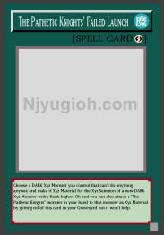The Pathetic Knights' Failed Launch Quick-Play Spell Choose a DARK Xyz Monster you control that can't do anything anyway and make it Xyz Material for the Xyz Summon of a new DARK Xyz Monster with 1 Rank higher. Oh and you can also attach 1 "The Pathetic Knights" monster in your hand to that monster as Xyz Material by getting rid of this card in your Graveyard but it won't help. SUPER RARE |