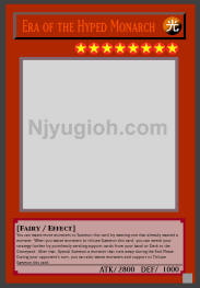 Era of the Hyped Monarch LIGHT / Fairy / Level 8 / ATK 2800 / DEF 1000 You can waste more monsters to Summon this card by wasting one that already wasted a monster. When you waste monsters to tribute Summon this card, you can wreck your strategy further by pointlessly sending support cards from your hand or Deck to the Graveyard. After that, Special Summon a monster that runs away during the End Phase. During your opponent's turn, you can also waste monsters and support to Tribute Summon this card. ULTRA RARE |