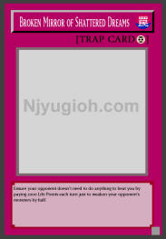 Broken Mirror of Shattered Dreams Continuous Trap Ensure your opponent doesn't need to do anything to beat you by paying 2000 Life Points each turn just to weaken your opponent's monsters by half. SUPER RARE |