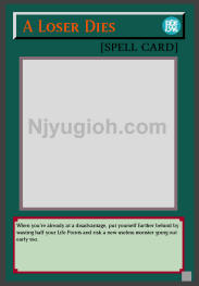 A Loser Dies Normal Spell When you're already at a disadvantage, put yourself further behind by wasting half your Life Points and risk a new useless monster going out early too. ULTRA RARE |