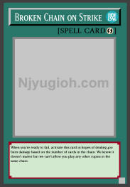 Broken Chain on Strike Quick-Play Spell When you're ready to fail, activate this card in hopes of dealing 400 burn damage based on the number of cards in the chain. We know it doesn't matter but we can't allow you play any other copies in the same chain. COMMON |