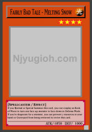 Fairly Bad Tale - Melting Snow LIGHT / Spellcaster / Level 4 / ATK 1850 / DEF 1000 If you Normal or Special Summon this card, you can cosplay as Book of Moon to turn one face-up monster to face-down in Defense Mode. If you're desperate for a monster, you can prevent 7 resources in your hand or Graveyard from being retrieved to revive this card. SHORT PRINT COMMON |