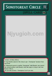 Sonotgreat Circle Quick-Play Spell Activate 1 of these effects. ● Copy Reinforcement of the Army to get 1 "Sonotgreat" monster from your Deck. ● Temporarily protect a useless "Sonotgreat" Link Monster you control that wasted another Link Monster with that name to bring it out from Monster Effects. You can only activate 1 "Sonotgreat Circle" per turn. SUPER RARE |