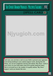 Sky Diver's Broken Modules - Multiple Failures Continuous Spell Each turn, you can lose a card on your field to prevent your opponent from doing anything to your useless support cards. During the End Phase, you can set completely obvious and useless "Sky Diver" cards in your Grave on your field where they'll be quickly thwarted when they're activated up to the number of equally useless "Sky Diver" support cards you wasted this turn. SECRET RARE |