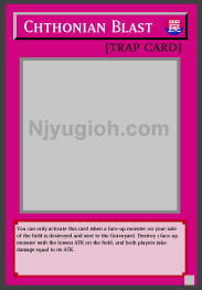 Chthonian Blast Normal Trap You can only activate this card when a face-up monster on your side of the field is destroyed and sent to the Graveyard. Destroy 1 face-up monster with the lowest ATK on the field, and both players take damage equal to its ATK. COMMON |