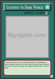 Gateway to Dark World Quick-Play Spell If you activate this card, you can Normal Summon, Flip Summon or Special Summon during the turn this card is activated. Special Summon from your Graveyard 1 monster that includes "Dark World" in its card name. COMMON |